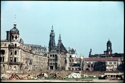 Blick von Süden auf die Ruinen des Dresdner Schlosses und des Georgentores mit der Katholischen Hofkirche im Hintergrund (1959)